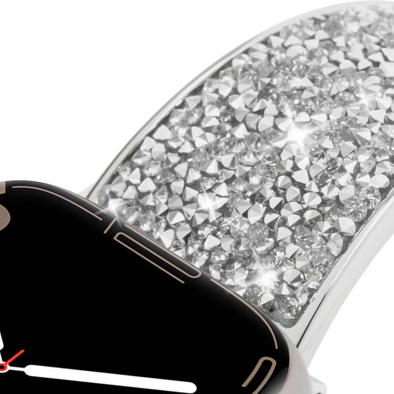 Elegancka bransoleta do zegarka Apple Watch wykonana ze stali nierdzewnej zdobiona prawdziwymi kryształami.Mocne zapięcie oraz szeroki zakres regulacji pozwalają idealnie dopasować się do kształtu nadgarstka, zapewniając wygodę użytkowania.