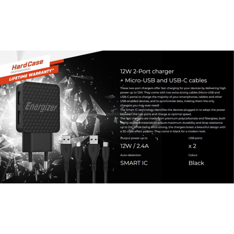 Energizer HardCase - Ładowarka sieciowa 2x USB-A 12W + Kabel USB-C & Micro USB (Czarny)