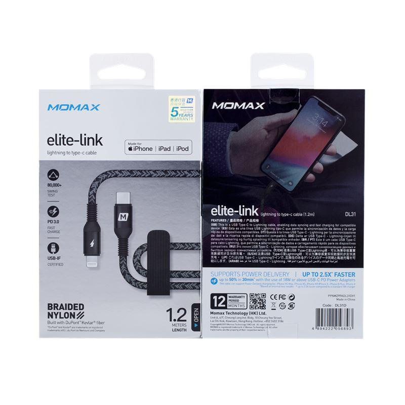 - Nowej generacji przewód USB-C do Lightning z serii MOMAX Elite Link w nylonowym oplocie o długości 1,2 m (wzmacniany włóknami aramidowymi). Technologia PD 3.0 zapewnia szybkie ładowanie w iPhonie lub iPadzie Pro przy użyciu nowoczesnych ładowarek USB-C 18