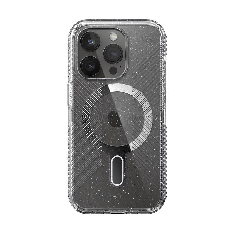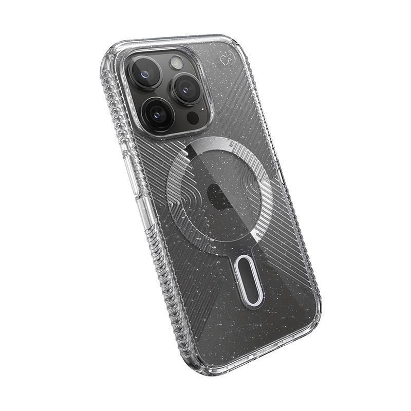 Presidio® Lux Glitter Grip MagSafe® z technologią antypoślizgową ClickLock™ Interlock to przezroczyste etui z wbudowanym magnesem, kompatybilnym z akcesoriami Apple MagSafe®.Lśniące kryształki brokatu, odporne na blaknięcie, nadają niezwykłej elegancji.