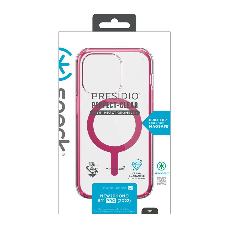 - Speck Presidio Perfect-Clear with Impact Geometry® + MagSafe to etui z wbudowanym pierścieniem magnetycznym, kompatybilnym z wszystkimi akcesoriami Apple MagSafe®.