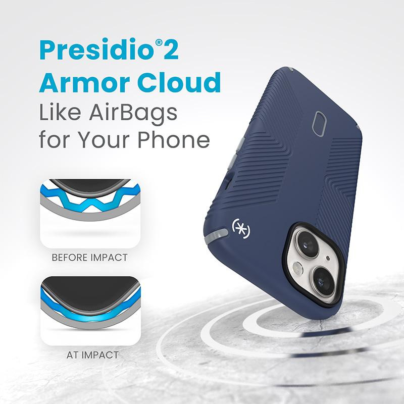 Speck Presidio®2 Grip MagSafe® z technologią antypoślizgową ClickLock™ Interlock to super ochronne etui z wbudowanym magnesem, kompatybilnym z akcesoriami Apple MagSafe®.Innowacyjne uchwyty antypoślizgowe z precyzyjnymi nacięciami (inverted grips)zapewniają jeszcze lepszą przyczepność gwarantując pewny i wygodny chwyt podczas pisania lub robienia zdjęć