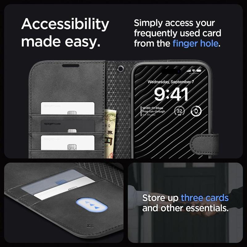 Wielofunkcyjne etui Spigen Wallet S Pro do Apple iPhone 15 Pro Max. Ten wyjątkowy produkt nie tylko chroni Twój telefon, ale również dodaje mu elegancji i stylowego wyglądu. Pokrowiec został wyprodukowany z wysokiej jakości skóry PU, dzięki czemu prezentuje się wyjątkowo elegancko. Dodatkowo, staranne wykonanie sprawia, że otrzymujemy solidny i trwały produkt o smukłych proporcjach.Najważniejszą cechą pokrowca, na którą warto zwrócić uwagę, jest jego wielofunkcyjność. Oprócz przechowywania telefonu, możesz w nim pomieścić także karty kredytowe, pieniądze oraz dokumenty. Dzięki specjalnym kieszeniom łatwo uporządkujesz najpotrzebniejsze przedmioty oraz zapewnisz sobie do nich szybki dostęp.
