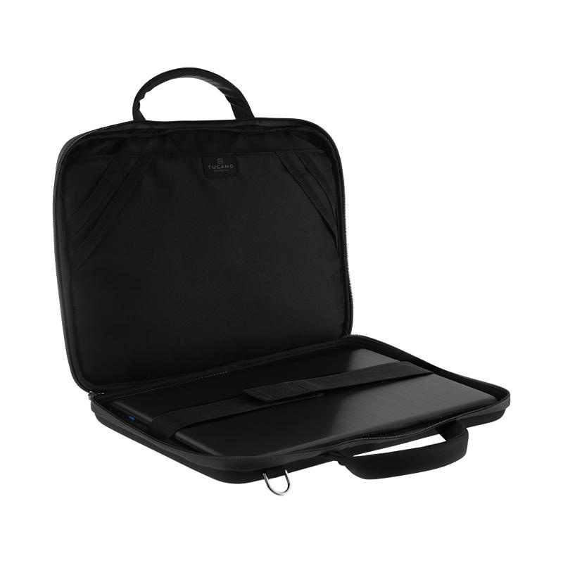 Elegancka i wygodna torba zaprojektowana do bezpiecznego transportu oraz użytkowania laptopów do 14". Dzięki obszernej, wewnętrznej komorze oraz dodatkowym elastycznym opaskom użytkownik jest w stanie pracować na swoim urządzeniu wprost z torby, co przekłada się na wygodę i ciągłą ochronę obudowy laptopa. Za bezpieczeństwo konstrukcji odpowiada specjalnie termicznie formowany tył torby, który jest wykonany z materiału o dużej gęstości. Dla wygody przenoszenia Tucano Slim posiada zdejmowany, regulowany pasek na ramię z centralnie umiejscowioną poduszeczką, stanowiącą wygodne oparcie na ramieniu.Cechy produktu: