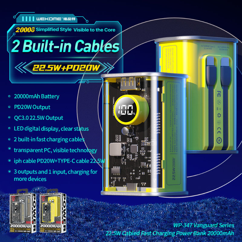 WEKOME WP-347 Vanguard Series - Power bank 20000 mAh Super Fast Charging z wbudowanym kablem USB-C PD 20W & Lightning + USB-A QC3.0 22.5W (Żółty)