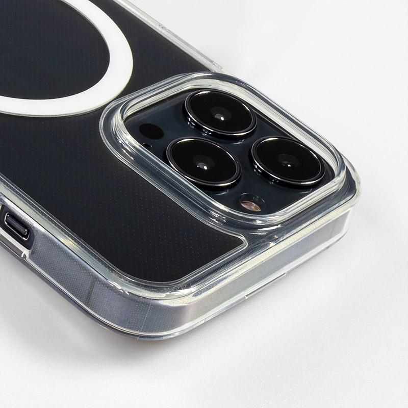Przezroczyste etui ochronne do iPhone’a 13 Pro z wbudowanym magnesem do ładowarki i akcesoriów MagSafe. Ukryty w hybrydowej powłoce pierścień magnetyczny (składający się z 39 mniejszych magnesów) sprawia, że ładowarka oraz pozostałe akcesoria MagSafe dopasowują się do telefonu za każdym razem w idealny sposób.