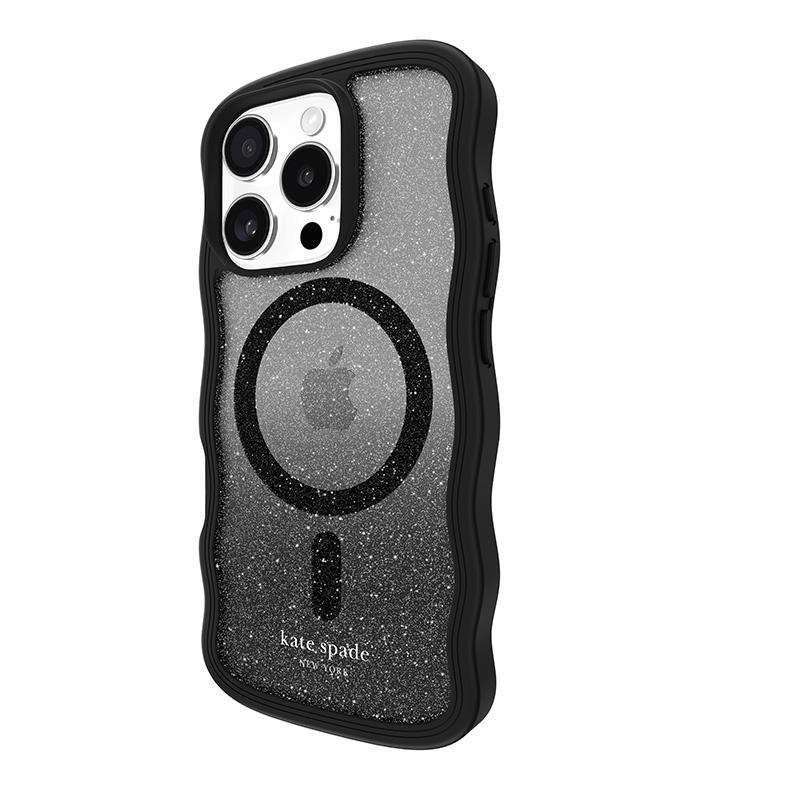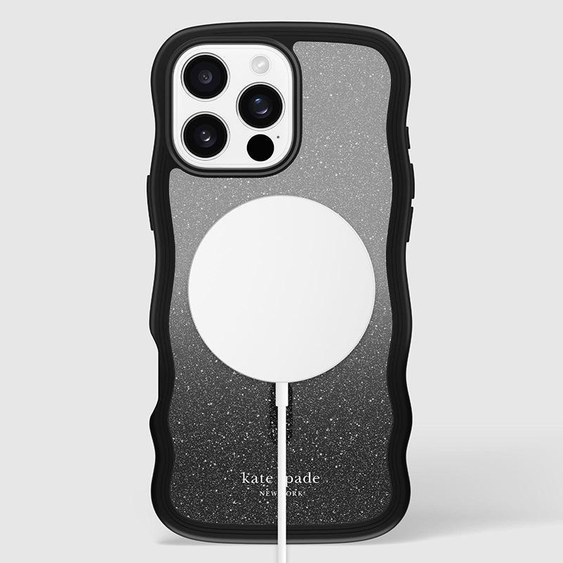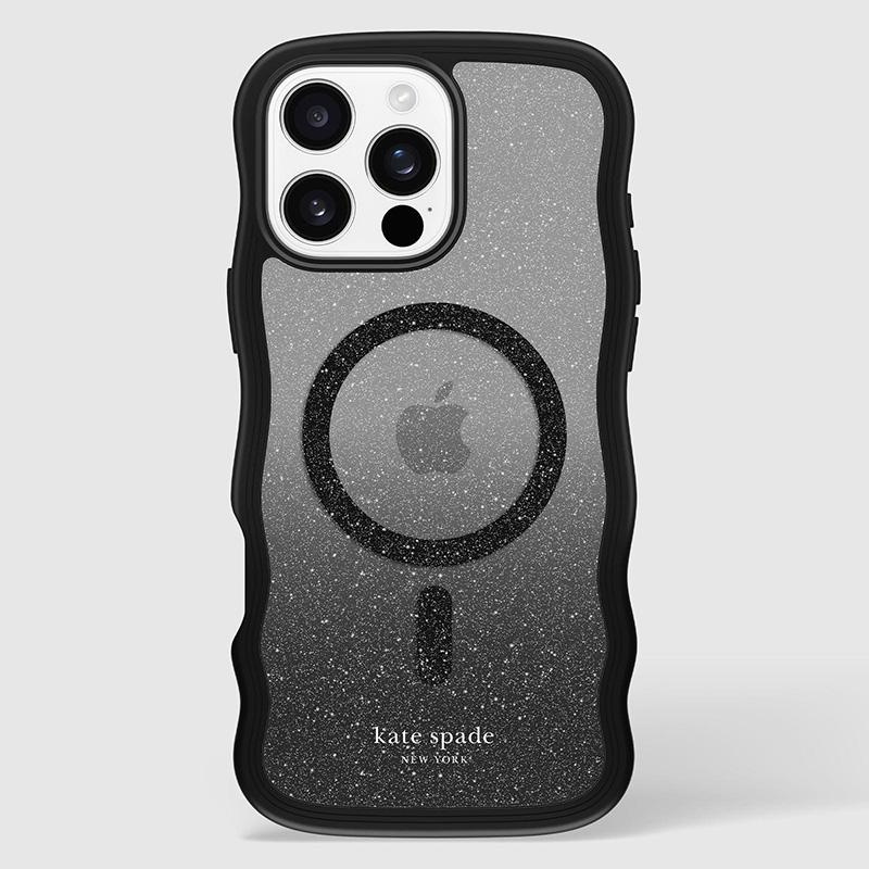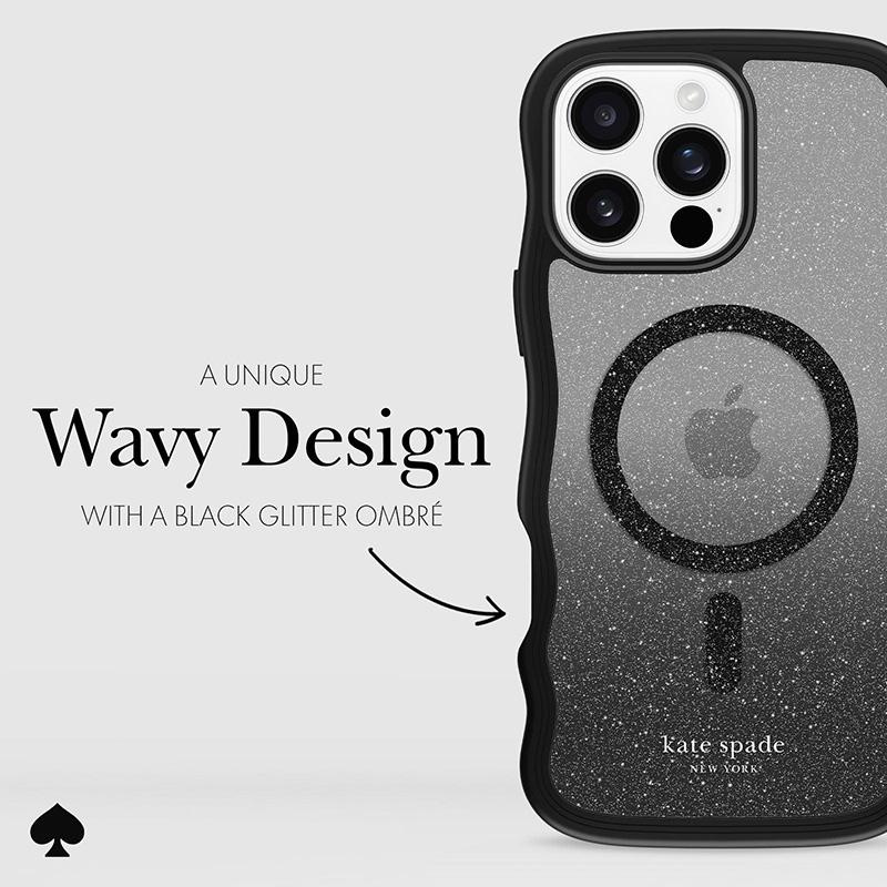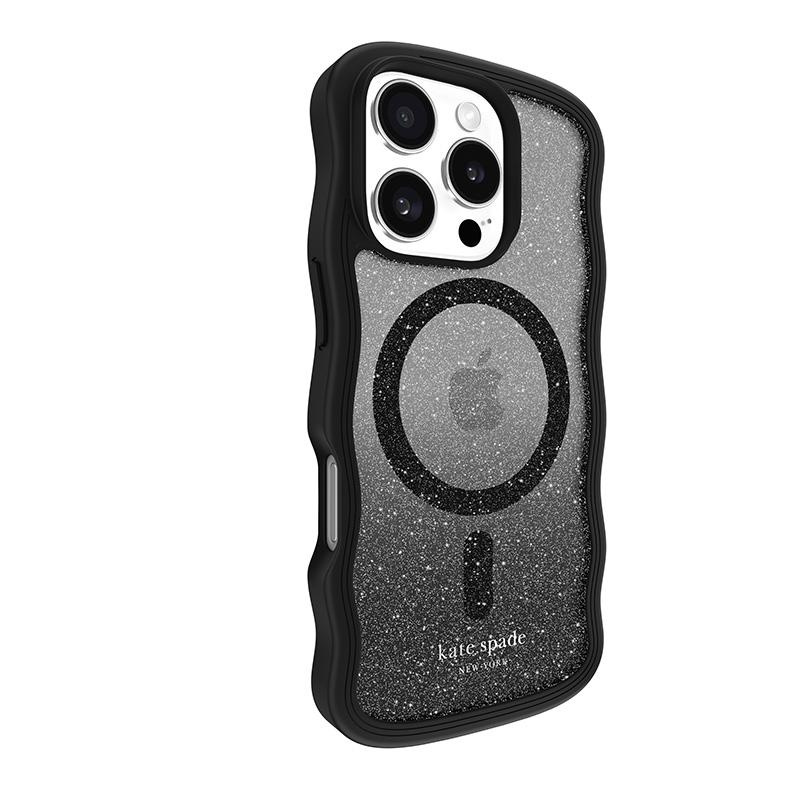 - Etui Kate Spade New York Wavy MagSafe do iPhone 16 Pro to stylowe połączenie funkcjonalności i modnego designu. Jego unikalny falisty wzór, pokryty eleganckim czarnym brokatowym ombre, nadaje Twojemu telefonowi wyjątkowy wygląd, który doskonale sprawdzi s