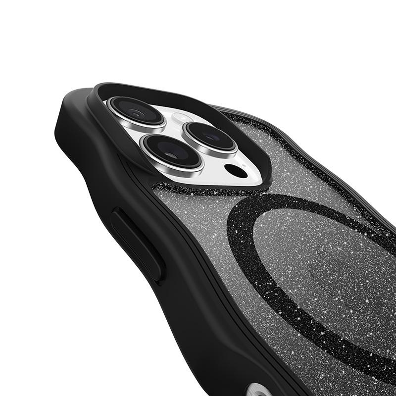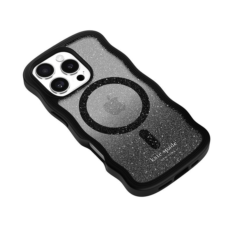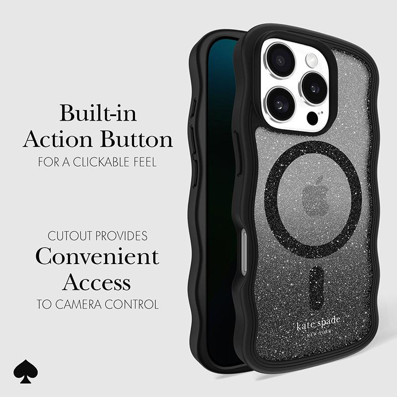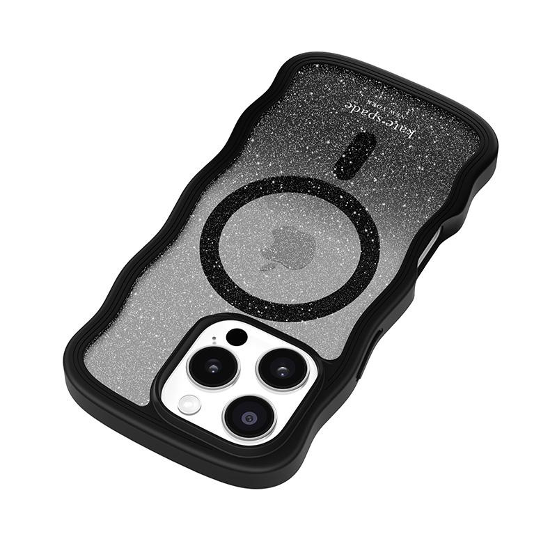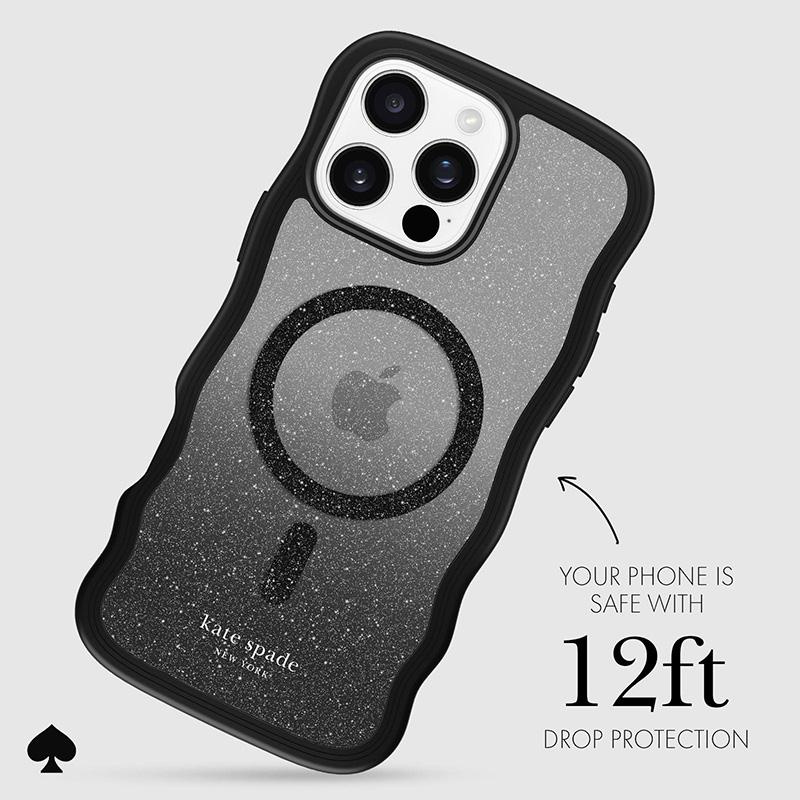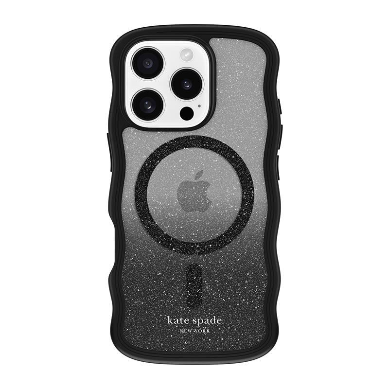 - Etui Kate Spade New York Wavy MagSafe do iPhone 16 Pro to stylowe połączenie funkcjonalności i modnego designu. Jego unikalny falisty wzór, pokryty eleganckim czarnym brokatowym ombre, nadaje Twojemu telefonowi wyjątkowy wygląd, który doskonale sprawdzi s