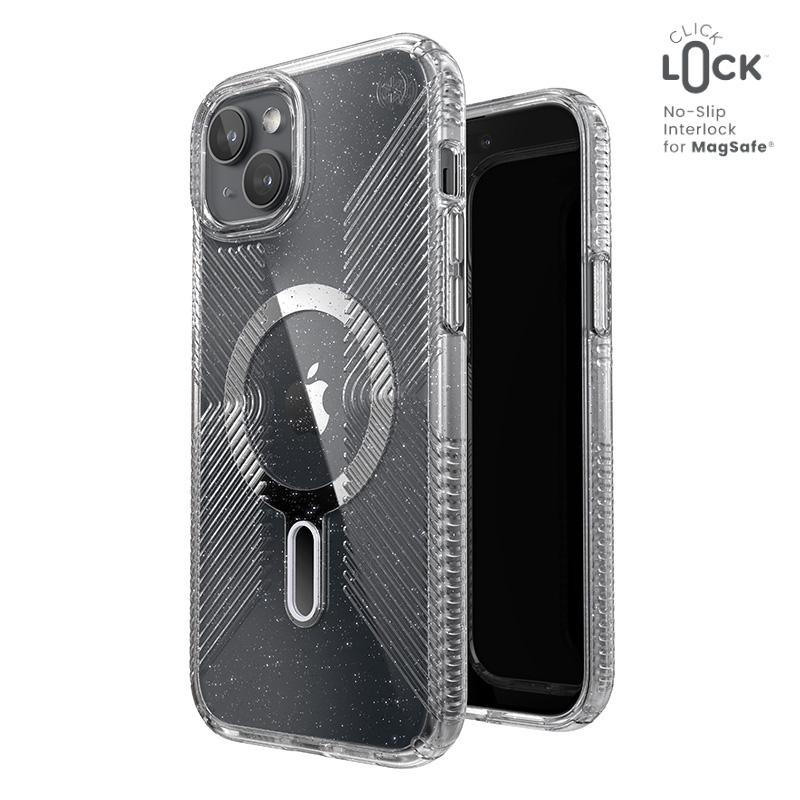 Presidio® Lux Glitter Grip MagSafe® z technologią antypoślizgową ClickLock™ Interlock to przezroczyste etui z wbudowanym magnesem, kompatybilnym z akcesoriami Apple MagSafe®.Lśniące kryształki brokatu, odporne na blaknięcie, nadają niezwykłej elegancji.