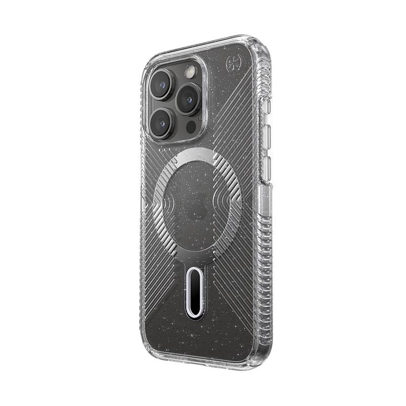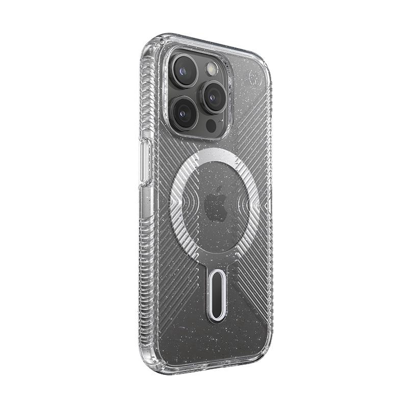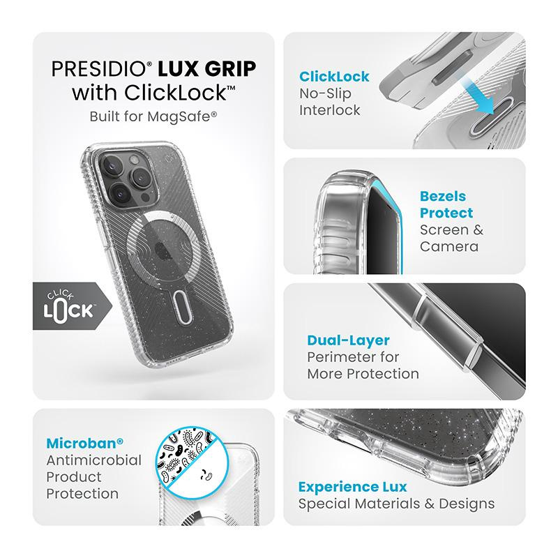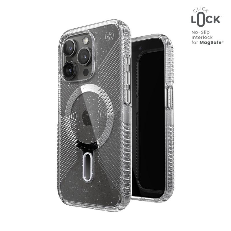 Presidio® Lux Glitter Grip MagSafe® z technologią antypoślizgową ClickLock™ Interlock to przezroczyste etui z wbudowanym magnesem, kompatybilnym z akcesoriami Apple MagSafe®.Lśniące kryształki brokatu, odporne na blaknięcie, nadają niezwykłej elegancji.