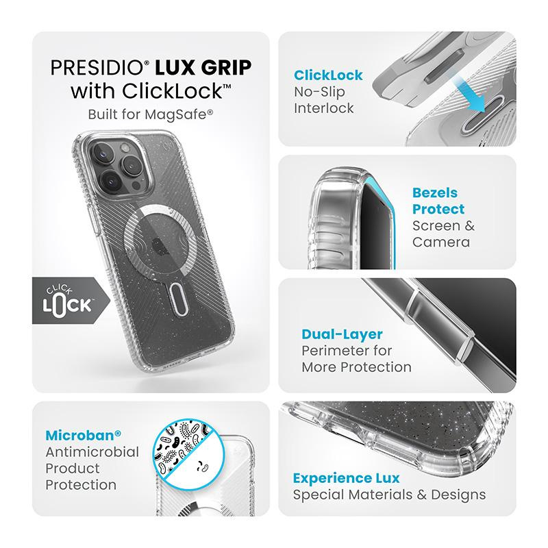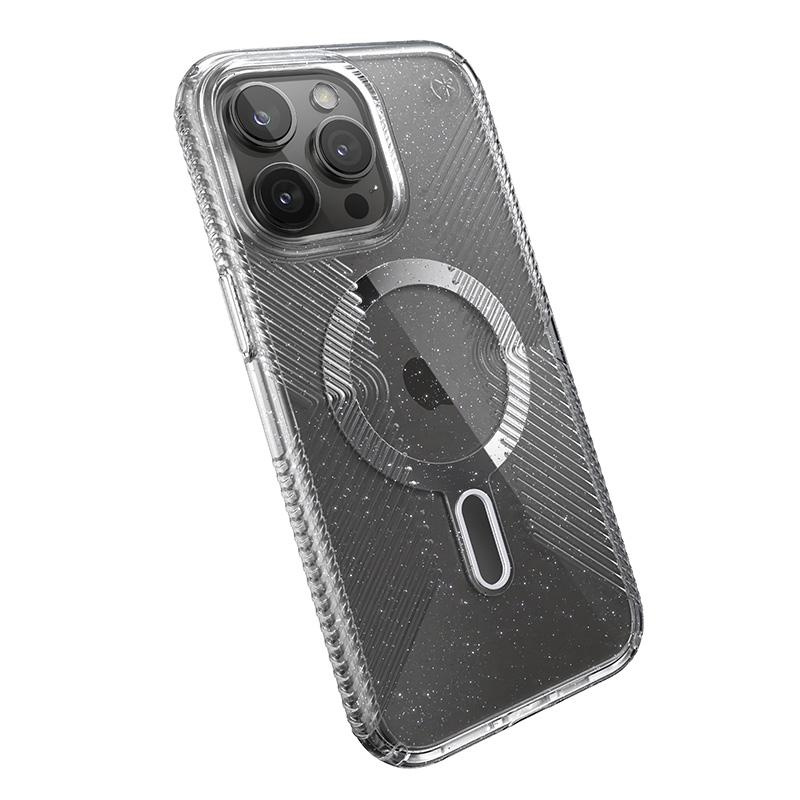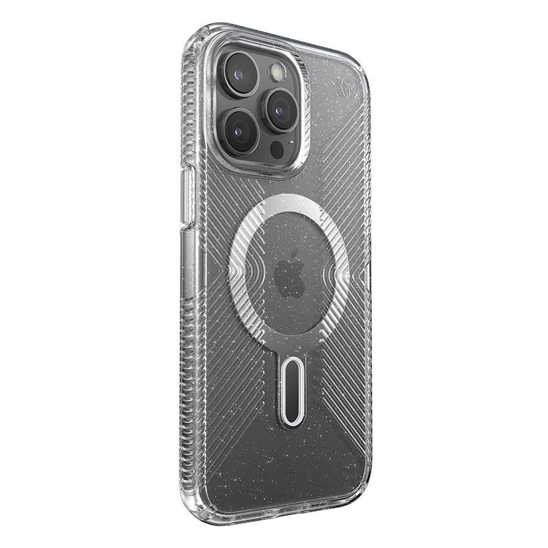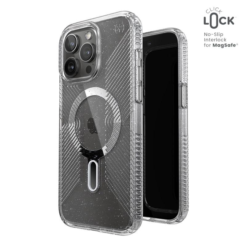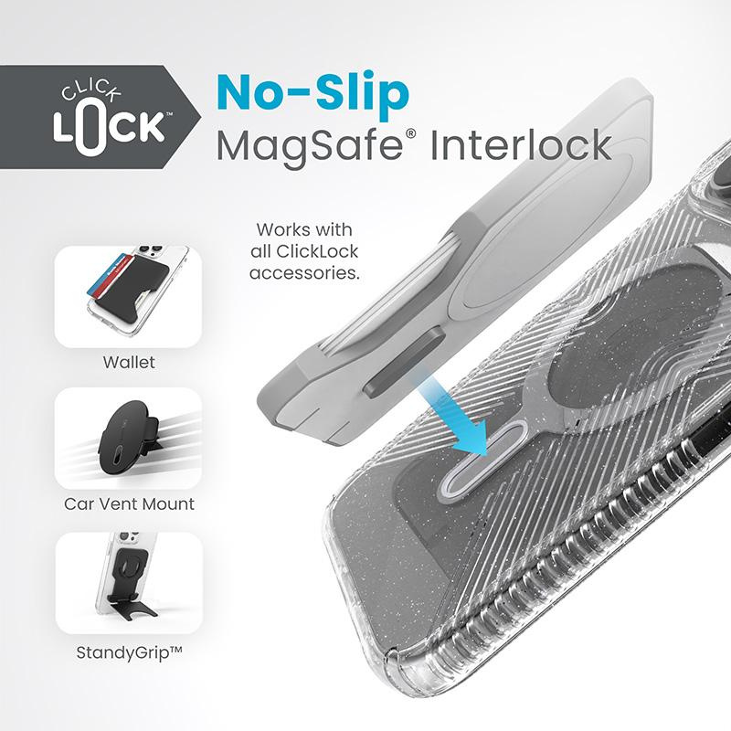 Presidio® Lux Glitter Grip MagSafe® z technologią antypoślizgową ClickLock™ Interlock to przezroczyste etui z wbudowanym magnesem, kompatybilnym z akcesoriami Apple MagSafe®.Lśniące kryształki brokatu, odporne na blaknięcie, nadają niezwykłej elegancji.