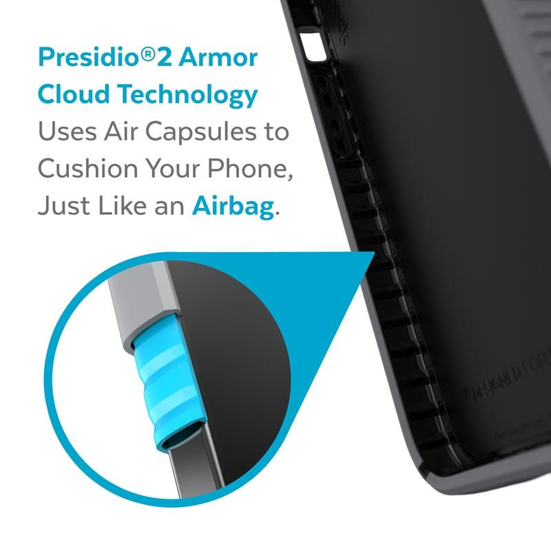 Najbardziej zaawansowany model etui zaprojektowany przez firmę Speck do iPhone’a 13. Antypoślizgowa konstrukcja z precyzyjnymi nacięciami (inverted grips) w znaczący sposób zwiększa komfort korzystania z telefonu Apple. Niezależnie od tego, czy iPhone’a używamy na dworze, podczas pracy w warsztacie lub np. na treningu, etui zapewnia pewny i wygodny chwyt.Etui Presidio2 Grip zostało ponadto wykonane w technologii Armor Cloud™, dzięki której obudowa Speck jest odporna na upadki z wysokości nawet 4 metrów. System mikrokapsułek wewnątrz ścianek etui działa na podobnej zasadzie, co poduszki powietrze stosowane w samochodach. W momencie upadku na twarde podłoże, kapsułki amortyzują siłę uderzenia przy pomocy skompresowanego w nich powietrza.