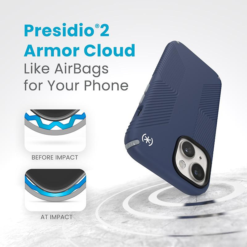 Najbardziej zaawansowany model etui z MagSafe zaprojektowany przez firmę Speck do iPhone’a 15. Antypoślizgowa konstrukcja z precyzyjnymi nacięciami (inverted grips) w znaczący sposób zwiększa komfort korzystania z telefonu Apple. Niezależnie od tego, czy iPhone’a używamy na dworze, podczas pracy w warsztacie lub np. na treningu, etui zapewnia pewny i wygodny chwyt.Etui Presidio2 Grip MagSafe zostało ponadto wykonane w technologii Armor Cloud™, dzięki której obudowa Speck jest odporna na upadki z wysokości nawet 4 metrów. System mikrokapsułek wewnątrz ścianek etui działa na podobnej zasadzie, co poduszki powietrze stosowane w samochodach. W momencie upadku na twarde podłoże, kapsułki amortyzują siłę uderzenia przy pomocy skompresowanego w nich powietrza.