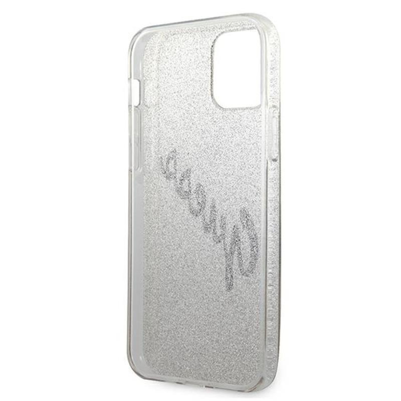 • Guess Glitter Gradient Script to brokatowe, przezroczyste etui z efektem gradientu. Ozdobione dużym, złotym logo Guess.