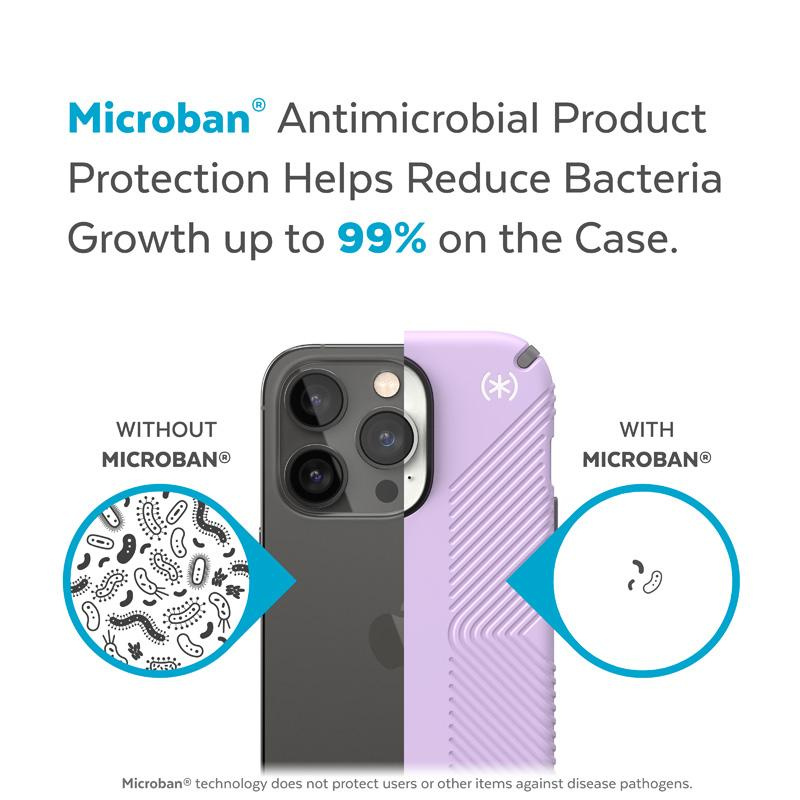 Oryginalna obudowa ochronna Speck z serii Presidio2 Grip oferuje też ochronę antybakteryjną MICROBAN® (światowy lider rozwiązań przeciwdrobnoustrojowych z szerokim portfolio ponad 25 zatwierdzonych technologii). Aktywny składnik wbudowany w strukturę etui powstrzymuje 99% bakterii, które gromadzą się na powierzchni etui. Technologia MICROBAN® zapewnia w ten sposób dożywotnią ochronę przed bakteriami powodującymi plamy i nieprzyjemne zapachy oraz działa na poziomie komórkowych, aby utrzymać czystość obudowy.