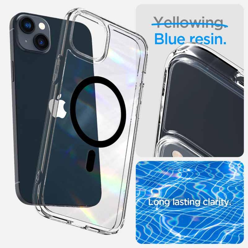 Spigen Ultra Hybrid Mag MagSafe to etui, którego ramki zostały wykonane z trwałego i odpornego na wstrząsy elastycznego TPU zwiększającego przyczepność i komfort użytkowania, a na jego tylnym panelu zastosowano wytrzymały poliwęglan. Etui jest lekkie i łatwe w montażu, a jego lekko wystające krawędzie chronią kamerę i ekran przed zarysowaniami na płaskich powierzchniach.Pokrowiec został wyposażony w technologie Air Cushion (poduszki powietrzne w rogach), która amortyzują wstrząsy, chroniąc smatfona podczas upadków.