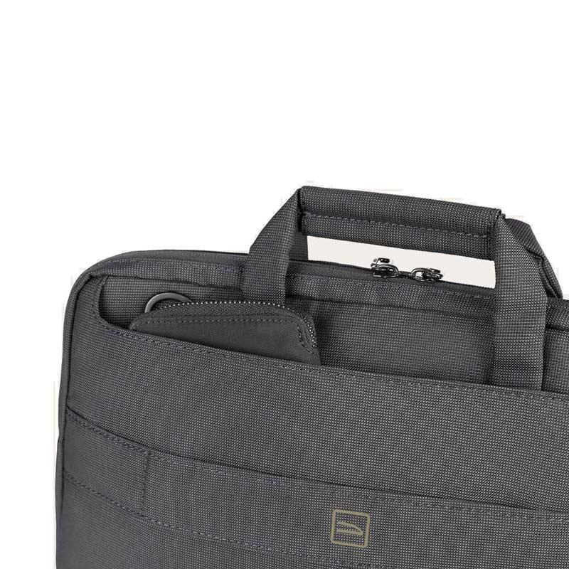 Biznesowa torba do bezpiecznego i wygodnego przenoszenia MacBook Pro 14" / laptopa 13", która pozwala się przekształcić ze średniej wielkości torby w dużą. Wykonana została z tkaniny wyprodukowanej z plastiku pochodzącego z recyklingu.Charakteryzuje się kompaktową przestrzenią i świetną organizacją kieszeni. Kieszeń na laptopa z systemem Anti-Shock, która amortyzuje i chroni urządzenie podczas wstrząsów lub uderzeń. Przednia kieszeń na przydatne akcesoria. Kieszenie zapinane na obustronne suwaki.
