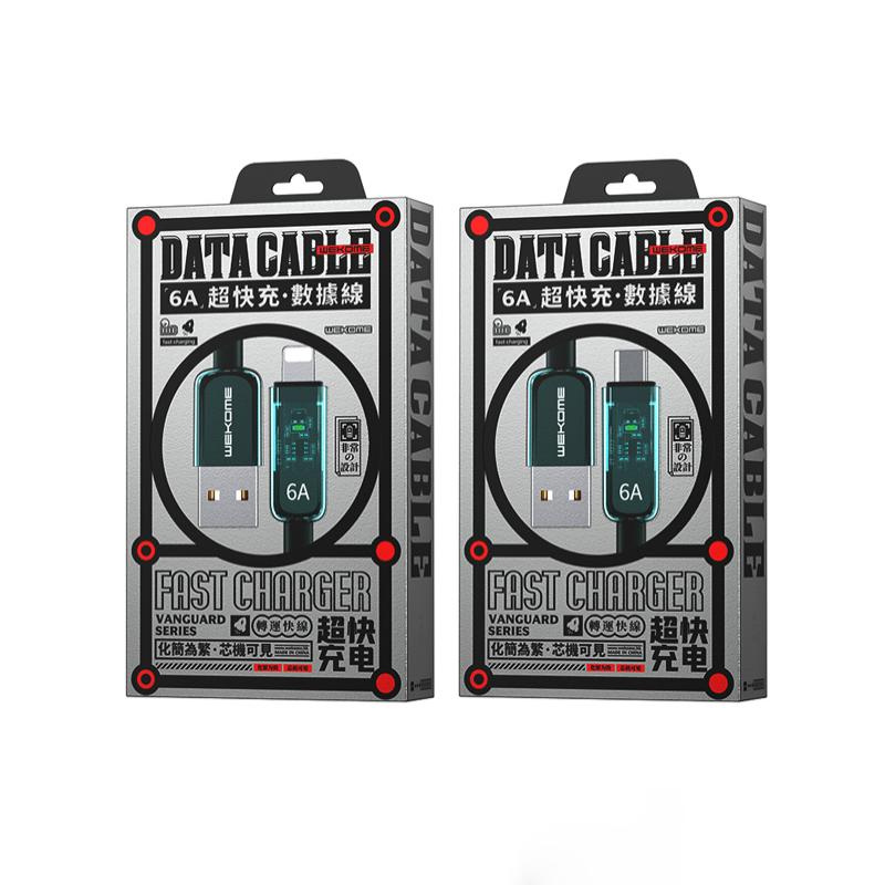 Kabel WEKOME WDC-180 Vanguard Series do ładowania i transmisji danych o długości 100 cm, wyposażony w złącze USB-A na Lightning.Kabel posiada przezroczystą obudowę wtyczki oraz wskaźnik ładowania LED. Przewód umożliwia przesyłanie danych z prędkością 480 Mb/s.