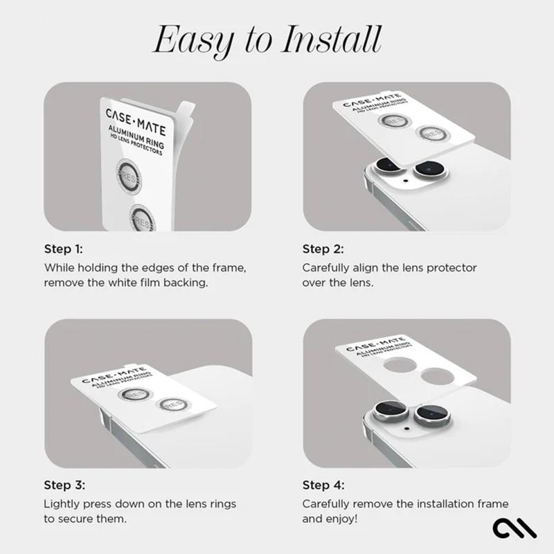 - Utrzymaj doskonały stan obiektywu aparatu iPhone'a dzięki Aluminum Ring Lens Protector od Case-Mate. Ta osłona została stworzona z metalowej ramki i hartowanego szkła HD, aby zabezpieczyć obiektyw tylnego aparatu przed zarysowaniami i pęknięciami, jednocz