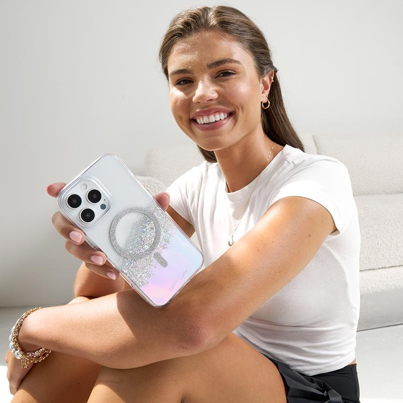 Eleganckie, półprzezroczyste etui ochronne zdobione subtelnymi płatkami srebra oraz efektem holograficznym. Holograficzne wykończenie to kolorowa, błyszcząca powierzchnia mieniąca się w świetle w zależności od kąta patrzenia i oświetlenia.Wbudowane magnesy sprawiają, że ładowarka MagSafe dopasowuje się za każdym razem precyzyjnie.