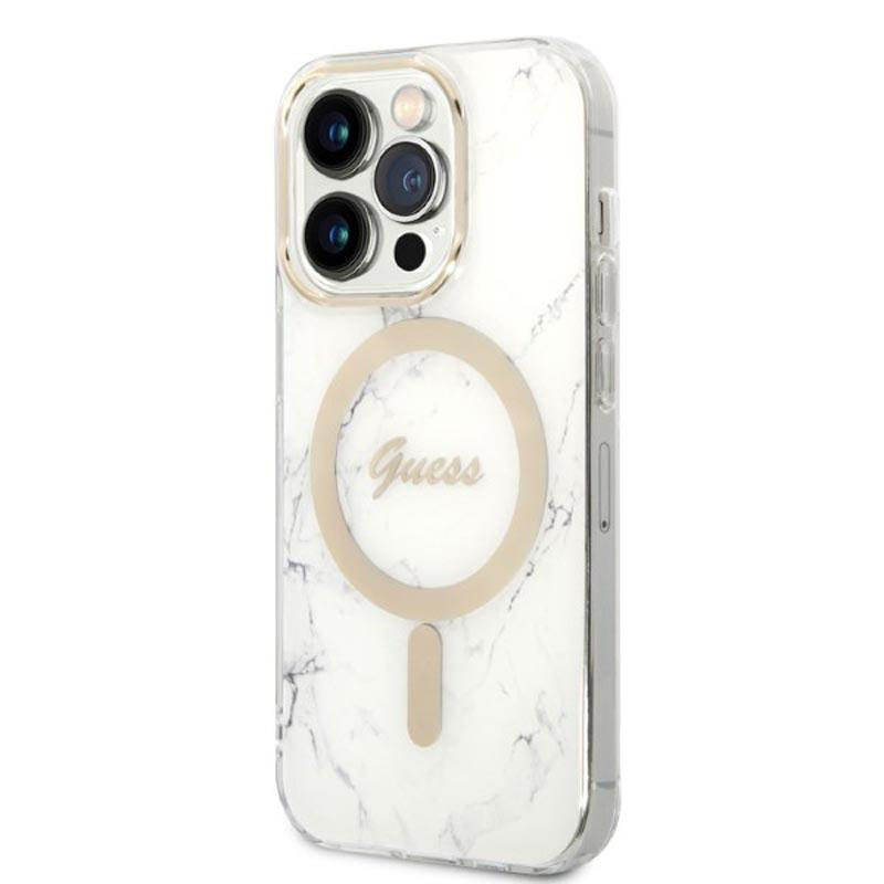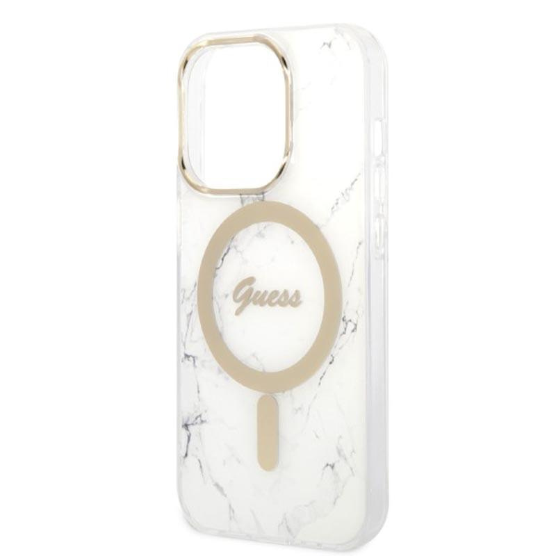 Guess Bundle Pack MagSafe IML Marble - Zestaw etui + ładowarka MagSafe iPhone 14 Pro Max (biały/złoty)