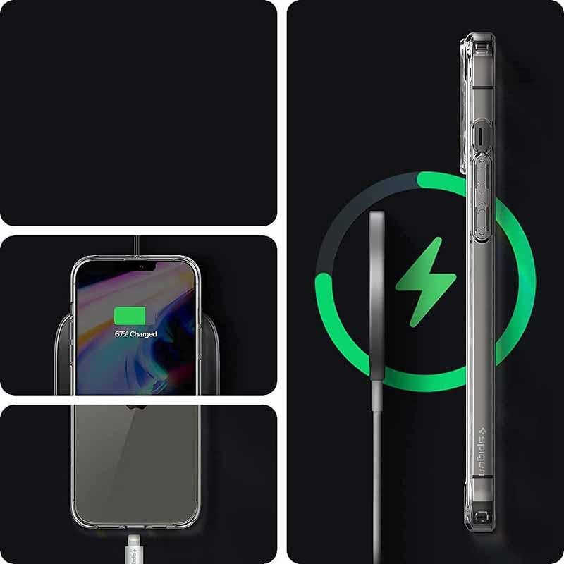 Spigen Ultra Hybrid to etui, którego ramki zostały wykonane z trwałego i odpornego na wstrząsy elastycznego TPU zwiększającego przyczepność i komfort użytkowania, a na jego tylnym panelu zastosowano wytrzymały poliwęglan. Etui jest lekkie i łatwe w montażu, a jego lekko wystające krawędzie chronią kamerę i ekran przed zarysowaniami na płaskich powierzchniach.Pokrowiec został wyposażony w technologie Air Cushion (poduszki powietrzne w rogach), która amortyzują wstrząsy, chroniąc smatfona podczas upadków.