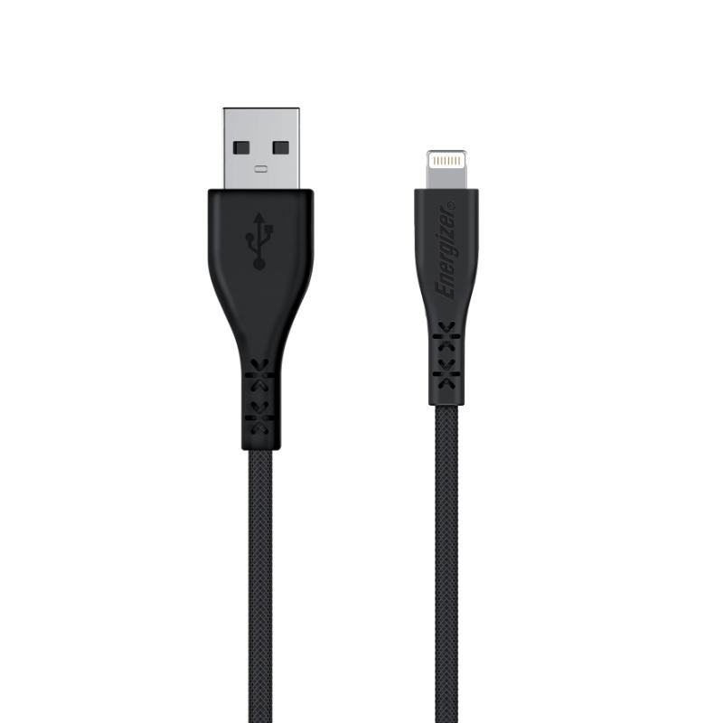 Kabel Energizer do ładowania i transmisji danych o długości 120 cm, wyposażony w złącze USB-A na Lightning i posiadający certyfikat Apple MFi.Kabel jest bardzo elastyczny, wytrzymały i odporny na splątanie dzięki specjalnemu oplotowi z tkaniny TPE. Przewód umożliwia przesyłanie danych z prędkością 480 Mb/s.