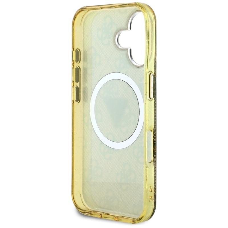 Brokatową powierzchnię zdobi charakterystyczny wzór 4G oraz złoty pierścień MagSafe, idealnie podkreślający trójkątne logo Guess.