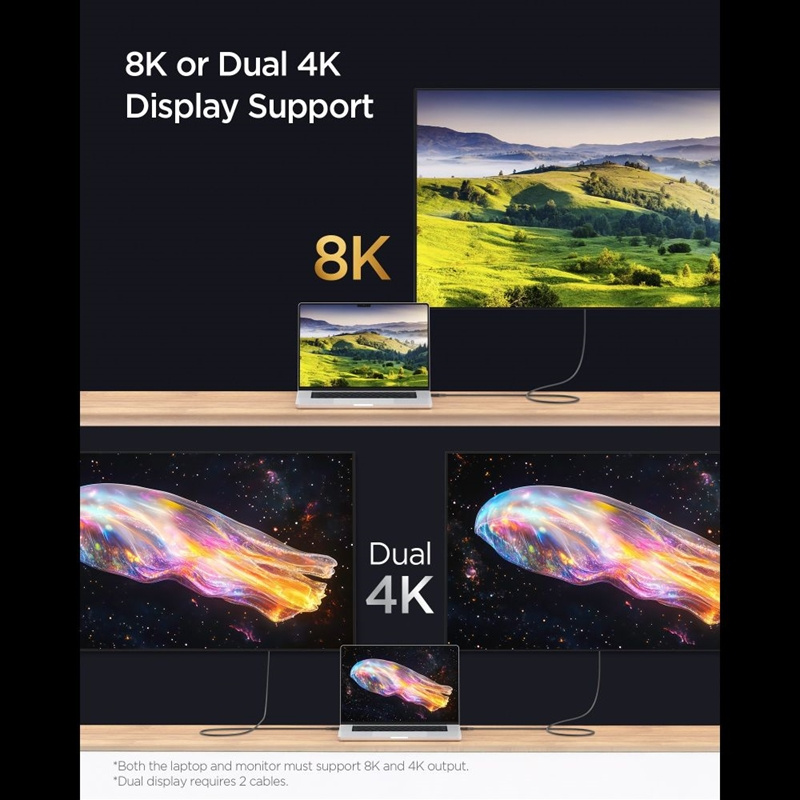 Transfer danych odbywa się z prędkością do 40 Gb/s (USB4 / USB4 Gen3), umożliwiając szybką synchronizację, kopiowanie plików oraz połączenie z wydajnymi urządzeniami. Kabel wspiera standardy Thunderbolt 3/4, a dzięki DisplayPort 2.0 umożliwia przesył wideo w rozdzielczości 8K (single) lub 4K (dual), co czyni go idealnym wyborem do monitorów, laptopów i stacji dokujących.